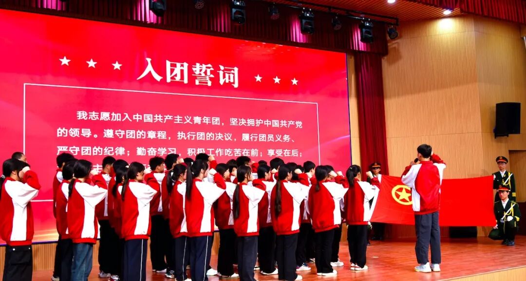 活动在庄严的国歌声中拉开序幕,激昂的旋律瞬间点燃全场热情。集体入团仪式环节,新团员名单宣读完毕后,中国共产主义青年团团旗缓缓入场,新团员代表精神抖擞步入会场。老团员们郑重地为新团员佩戴团徽,一枚枚团徽承载着共青团的荣耀与责任,传递着新老团员间的使命传承。“我志愿加入中国共产主义青年团……”在铿锵有力的入团宣誓声中,新老团员高举右拳,以坚定的誓言许下为共产主义事业奋斗的青春承诺。老团员代表结合自身成长经历,分享感悟,鼓励新团员奋勇拼搏;新团员代表则表达了加入共青团的自豪与投身青春奋斗的决心。