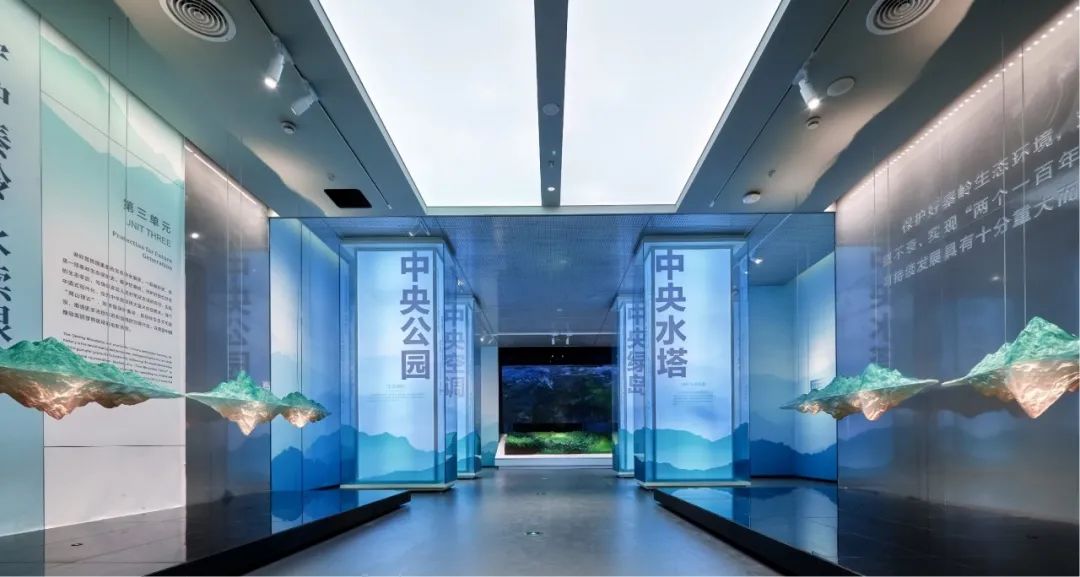 第三单元“守护秦岭 永续根脉”,分四个小节,第一节“山清水秀的生态屏障”围绕秦岭“中央水塔”“中央公园”“中央绿肺”“中央空调”等内容,以南水北调中线工程为突出展项,表达国家生态保护意志,凸显秦岭生态保护的重要性和紧迫性;第二节“中华民族的共同守望”展示新中国成立以来秦岭保护的挑战和成就,六省一市的协作共治举措和成效;第三节“‘两山转化’的当代实践”展现秦岭保护的行动和取得的丰硕成果;第四节“生息与共的绿色家园”通过沉浸式场景,引导思考人与自然和谐共生的时代使命。