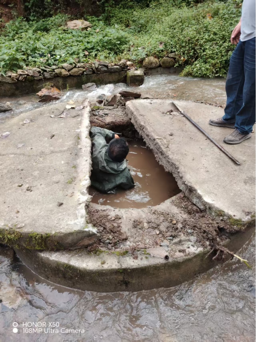 管水员鲍南山、王建勋闻讯而动,迅速奔赴现场,两人不顾雨后泥泞,立即展开勘查。淤积物已堵塞管道深处,常规清理工具难以奏效。时间紧迫,王建勋当机立断:“我下去疏通!”话音未落,他便只身潜入浑浊的蓄水池,池内污水没过胸口,能见度极低,泥沙不断涌入。他凭借经验摸索到堵塞点,奋力清除淤积物,汗水与污水混为一体。鲍南山则在池外配合,接力传递工具。经过两个小时的艰苦作业,淤积的泥沙和杂物终于被清除,排水口重新通畅,清水奔涌而出。