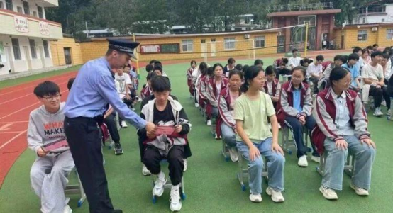 在学校大操场上,民警向学生们普及了有关毒品的知识,涵盖了毒品的种类,来源,产生的危害,并结合一些真实的案例,向在场的师生们详细讲解了包括“上头电子烟”、“笑气”和“罂粟”在内的多种新型毒品的伪装及危害性。呼吁广大师生们深刻认识到毒品的危害,养成健康的生活习惯,自觉地远离毒品的诱惑。同时介绍了电信网络诈骗的常见手段与防范措施,通过剖析网络游戏虚假交易诈骗、刷单、冒充公检法诈骗等典型案例,提醒大家务必保持警惕,不轻易泄露个人信息,不随意点击不明链接,不向陌生人转账汇款。民警同时倡议广大同学将所学到的禁毒知识、反诈知识分享给家人与朋友,携手筑牢防毒、反诈防线。