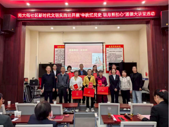 当天下午,商南县城关街道南大街社区新时代文明实践站开展了“中秋忆党史 明月照初心”道德讲堂活动,树立文明新风,学习正面典型,弘扬社会正能量。商南县供销合作社联合社党支部、商南县电影院电影放映中心党支部、在职党员,本届道德模范,社区居民代表、社区部分党员代表、南大街社区全体干部等60余人参加活动。