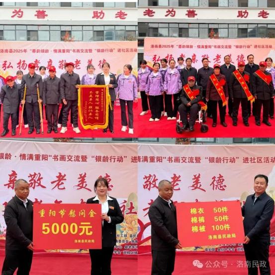 活动期间,“五好老人”受到表彰,胸前红花与绶带彰显着他们的模范风采。入住老人代表及家属向敬老院全体工作人员赠送锦旗,“管理用心,服务用情,不是亲人,胜似亲人”的真挚感言,饱含着老人们对服务的高度认可与深切感激。多家参会单位积极开展爱心捐赠,为老人们送上棉衣、棉被等生活物资及慰问金,以实际行动传递着敬老爱老的社会正能量。活动中现场了宣读《洛南县“银龄行动”倡议书》,号召老年朋友发挥余热,为洛南发展贡献力量。