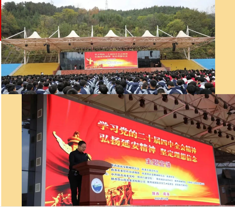 陕西省延安精神研究会常务副会长兼宣讲团团长、省发改委原副主任张文波,中共陕西省委党校原副校长、省延安精神研究会第四届常务副会长郑志飙,省延安精神研究会副秘书长兼宣讲团副团长王晓莉,市延安精神研究会会长、市政协原主席王甲训,市延安精神研究会常务副会长刘少鸿,市延安精神研究会副会长、秘书长全玉民,商洛中学校长傅先亮出席活动,商洛中学2800余名师生聆听了宣讲。