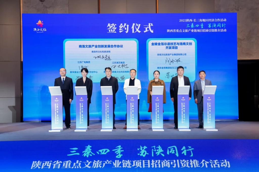 本次活动,商洛市成功促成两大文旅合作项目签约,一是商洛市文旅局与江苏广电集团好享购物频道、江苏演艺集团交响乐团、新华报业江苏经济报双创中心、南京市跳跳鱼文化科技有限公司等企业共同签订“商洛文旅产业创新发展项目”合作协议,双方将围绕商洛文创产品研发、文旅产品宣推、文旅商品直播带货、南京-商洛康养旅游专列策划运营以及文化交流等核心内容开展合作。二是洛南文化旅游产业集团有限公司与南京金箔集团宝玉工艺有限公司签署“金陵金箔非遗技艺与洛南文创开发项目”合作协议,该项目总投资额1200万元,聚焦“金箔非遗+洛南文脉”融合发展,计划通过打造专属文化IP、开发多层次文创产品矩阵、构建线上线下联动运营模式、升级非遗展示体验空间、设计景区专属旅游线路等举措,推动非遗资源与地方文旅深度融合。