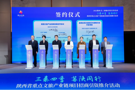 本次活动,商洛市成功促成两大文旅合作项目签约,一是商洛市文旅局与江苏广电集团好享购物频道、江苏演艺集团交响乐团、新华报业江苏经济报双创中心、南京市跳跳鱼文化科技有限公司等企业共同签订“商洛文旅产业创新发展项目”合作协议,双方将围绕商洛文创产品研发、文旅产品宣推、文旅商品直播带货、南京-商洛康养旅游专列策划运营以及文化交流等核心内容开展合作。二是洛南文化旅游产业集团有限公司与南京金箔集团宝玉工艺有限公司签署“金陵金箔非遗技艺与洛南文创开发项目”合作协议,该项目总投资额1200万元,聚焦“金箔非遗+洛南文脉”融合发展,计划通过打造专属文化IP、开发多层次文创产品矩阵、构建线上线下联动运营模式、升级非遗展示体验空间、设计景区专属旅游线路等举措,推动非遗资源与地方文旅深度融合。