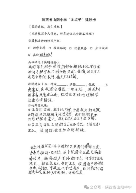 在山阳中学迎来建校百年的重要时刻,一场别开生面的座谈会温情举行。校长邵志诚、副校长虞华林、校长助理贾新民等校领导,与高一、高二20名学生代表及2名学生会副主席围坐一堂,开展了一场真诚、平等、走心的座谈——没有汇报,只有倾听;没有距离,只有共建。