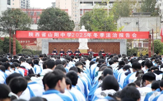 为深入推进依法治校,筑牢校园安全防线,强化师生法治观念,2025年11月10日下午,陕西省山阳中学在南校区尚德广场隆重举行了2025年冬季法治报告会暨法治副校长聘任仪式。山阳县人民检察院副检察长全长俊、山阳县城关派出所所长张斌、校长邵志诚、校长助理贾新民等校领导及高一高二全体师生参加了活动。报告会由德育处主任陈飞江主持。