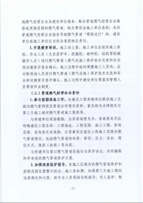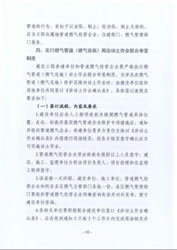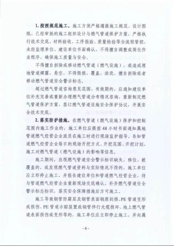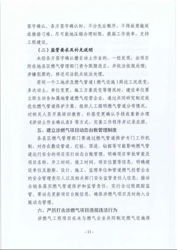 该《机制》共包含六个方面内容,适用于非燃气管道权属(产权)单位或个人在城市燃气管道(燃气设施)划定的保护范围内或控制范围内进行的各类工程施工行为。明确了燃气管道(燃气设施)周边施工项目涉及到的相关部门单位、专业经营企业、属地街办安全监管责任,厘清了燃气管道(燃气设施)周边施工项目参建各方(建设、监理、施工、设计单位)和燃气经营企业安全责任。同时,建立实施燃气管道(燃气设施)周边动土作业联合审签制度和涉燃项目动态台账管理制度,实行全过程跟踪监管,严厉打击第三方施工破坏燃气管道设施违法违规行为,推动燃气管道保护工作全链条监管。