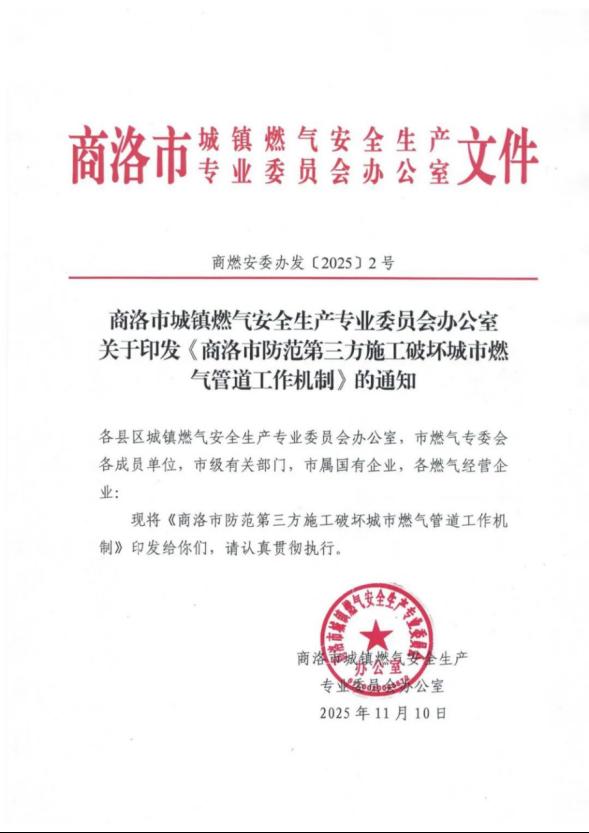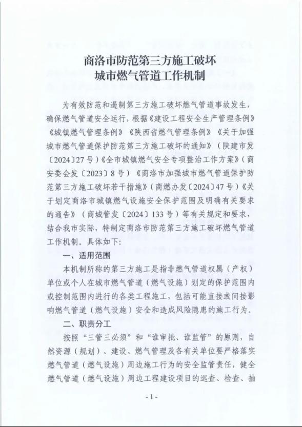为认真贯彻落实习近平总书记关于安全生产重要论述和燃气安全的重要指示批示精神,中省市关于群众身边不正之风和腐败问题集中整治—“整治城镇燃气安全问题”具体实事工作要求,扎实推进城镇燃气安全专项整治长效机制建立工作,加强燃气设施保护,严防第三方施工破坏,确保燃气管道安全运行,近日,商洛市印发了《商洛市防范第三方施工破坏城市燃气管道工作机制》。