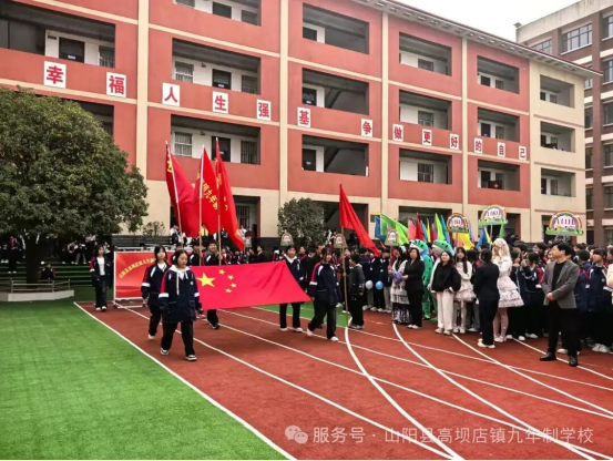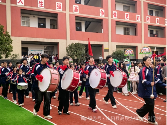 国旗护卫队庄严入场,党旗、校旗方队紧随其后。同学们步伐铿锵,目光坚定,展现着高坝学子在党的阳光沐浴下茁壮成长的昂扬气质。彩旗方队五彩斑斓,形成流动的彩色屏障;锣鼓方队节奏激昂,点燃全场热烈气氛;花环方队手持缤纷花束,为赛场增添亮丽色彩。