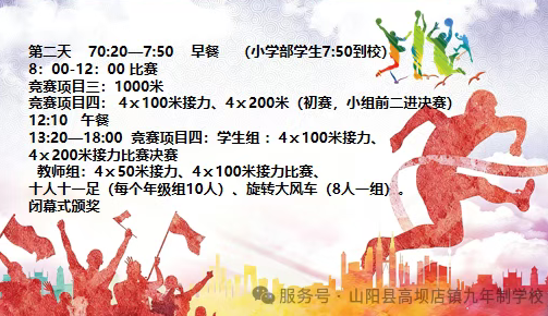 金秋送爽,丹桂飘香。在党的光辉指引下,在新时代教育方针的正确领导下,商洛市山阳县高坝店镇九年制学校迎来了第十三届运动会。这是高坝店镇九年制学校全面贯彻党的教育方针、落实立德树人根本任务的重要体现,是展示素质教育成果的盛会,更是彰显师生精神风貌的舞台。赛场上每一个拼搏的身影,都是青春最美的注脚;每一次挥洒的汗水,都是成长最珍贵的印记。