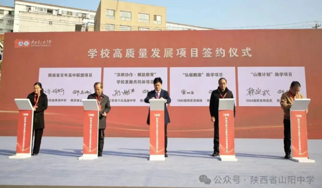 现场完成两大组项目签约,包括陕西省百年高中联盟、“苏陕协作・赋能教育” 学校发展共同体等4个教育合作项目和“校友回归 助山发展”两个县域发展项目。签约仪式标志着学校在资源整合、校地协同、助学赋能等方面迈出坚实步伐,为高质量发展注入新动能。