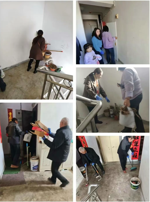 纪工委干部在西街社区祥居小区,林业站干部在西寺社区自建房排查消防安全隐患、清理楼道杂物