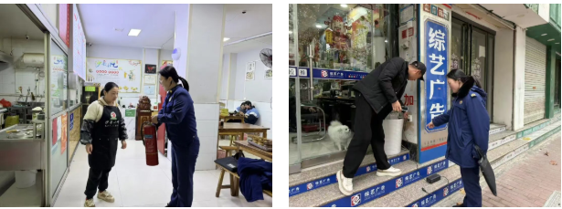 消防所在城区门店检查安全用电和灭火器配备情况,向商户讲解灭火器正确使用方法