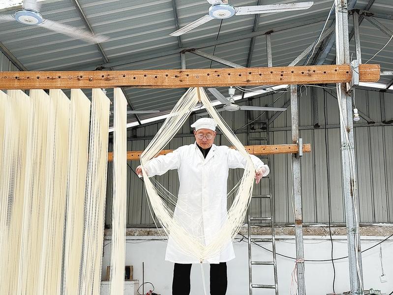 真正的考验在第二天凌晨三四点钟。李长满必须准时起身,趁着空气中温湿度最适宜的时刻,开始“上筷子”——将盘好的面条均匀缠绕到木杆上。待到上午10时许,阳光正好,再上架拉伸,等待风干。经过这层层费时费力的工序,面条最终才能展现出特有的白、细、韧、筋,达到口感爽滑,香味绵长。