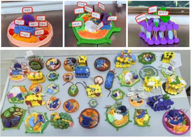 同学们本着遵守科学性,倡导创造性,兼顾环保性与美观性的原则,在考究细节、尽量符合生物实际的基础上,充分展示自己理解的细胞形态、结构和功能,同学们利用彩色超轻粘土、彩笔卡纸等制作了一幅幅形象生动的作品。
