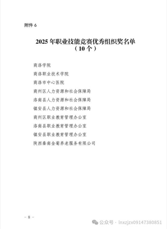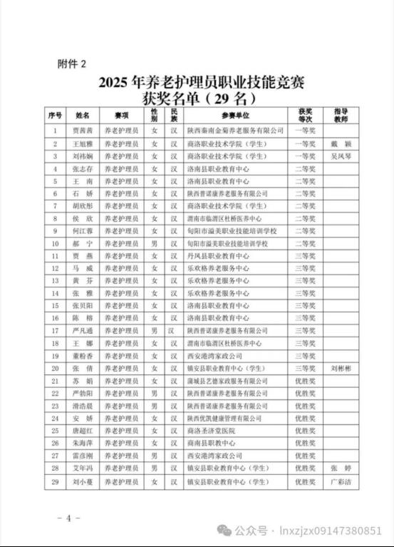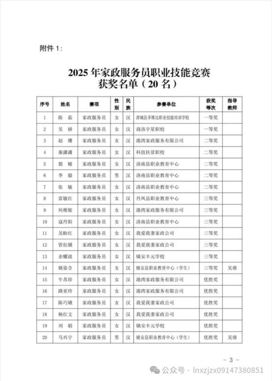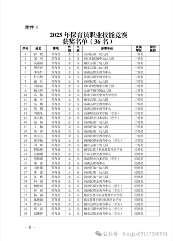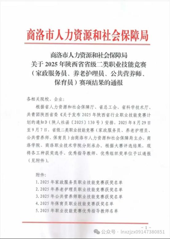 近日,2025年陕西省省级二类职业技能竞赛结果出炉,商洛市洛南县职业教育中心12名教师在家政服务员、养老护理员、保育员等赛项中斩获佳绩,其中家政服务员竞赛类郭娅、李毅、张敏荣获二等奖,寇丹阳荣获三等奖;养老护理员竞赛类张志存、王南荣获二等奖,张贝阳、陈榕荣获三等奖;保育员竞赛类李东轩、杜云彤荣获二等奖,吴娜、陈园荣获三等奖;同时洛南县职业教育管理办公室获评“优秀组织奖”。