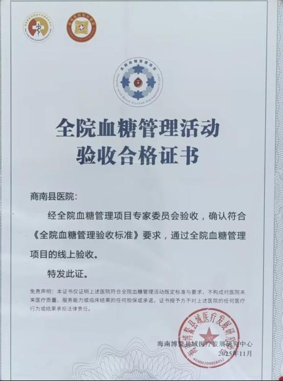 11月23日,2025“健康中国·健康县域”县域健康大会暨第六届县域慢病管理大会在北京举行。经大会专家委员会严格评审,全国共有84家单位通过县域慢病管理项目验收,398家单位被确定为“全院血糖管理项目建设单位”。商洛市商南县医院凭借扎实的工作基础、规范的流程管理和显著的慢病防治成效,顺利通过项目验收,成为2025年陕西省唯一通过该项目验收的医疗机构,标志着商南县医院慢病管理相关工作迈入与国家规划同步的新台阶,县域血糖管理迈入标准化新时代。