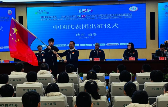 在出征仪式上,中国学生体育联合会副主席、陕西省学生体育协会主席刘宝平向中国学生体育联合会中小学排球分会秘书长、中国代表队领队刘洋授学体联会旗。