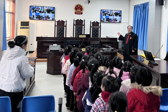 走进庄严肃穆的审判庭,孩子们眼中满是好奇与敬畏。在试马法庭庭长的带领下,他们逐一认识审判席、原告席、被告席等法庭设施,亲身感受司法场所的庄重氛围。庭长用童趣盎然的语言、生动鲜活的案例,将“法律是什么”“法庭有何用”等专业问题转化为孩子们能听懂的“成长指南”,让法治的种子在欢声笑语中悄然萌芽。
