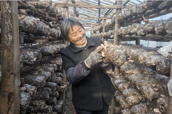 紧挨着方明良家香菇棚的刘先有也在自家的香菇棚里忙活着。他的大棚里,一袋袋香菇袋料整齐地排列着,一朵朵鲜嫩的香菇从袋口探出头来,散发着阵阵菌香。虽然年过花甲,刘先有夫妇俩却凭着踏实、勤劳的干劲儿,靠着种植香菇蹚出了一条致富路。