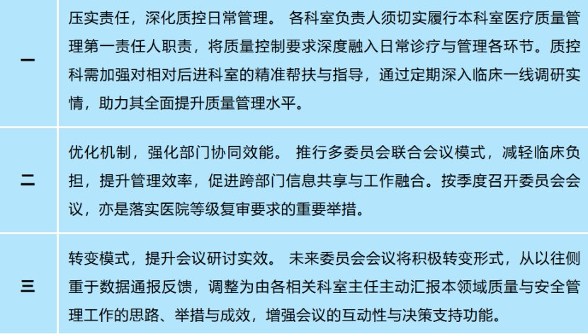 本次联合会议系统总结了季度医疗质量、安全及院感管理工作,明确了后续改进重点。会议要求各科室以此为契机,进一步筑牢质量安全底线,压实各级责任。医院将持续深化问题导向的精准施策,完善多部门协同机制,为保障患者安全、推动医院高质量发展筑牢坚实屏障。