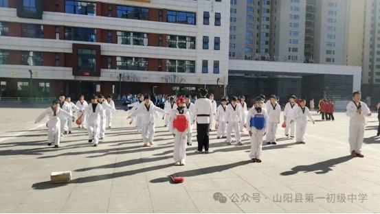 身着道服,脚踢木板,社员们以清脆的喝声、标准的品势动作,展现跆拳道“礼始礼终”的礼仪与坚韧不拔的精神,一招一式尽显少年意气。