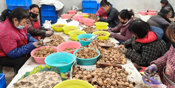 “镇上帮我们找好了场地,协调了用工,我们只管带着大家好好干!”核桃初加工车间负责人王国强说,目前,每天稳定有七八十人务工,新手和老手都能快速上手,“手脚麻利的工人,一个月能挣1500多块钱,比外出打零工还省心。”