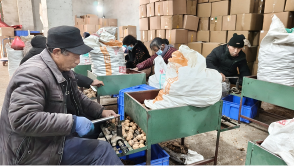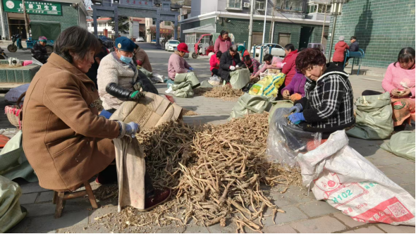 加工车间外的小区广场上,暖阳洒落,另一番繁忙同样动人。30多名群众围坐在一起,手持工具专注地为桔梗刮皮、整理,动作娴熟利落。“刮桔梗活儿不重,一天能挣50块钱,家门口干活还能照看孙子娃,啥都不耽误!”65岁的张大妈一边麻利地刮着桔梗,一边和身旁的邻居唠着家常,脸上满是满足。