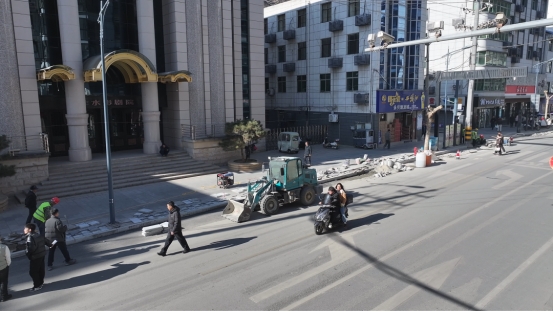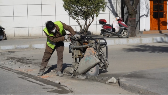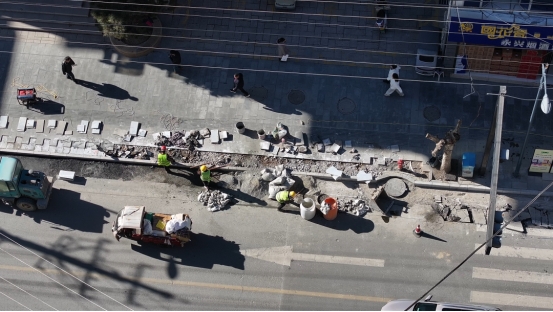 来到柞水县城区供水管网改造工程乾佑街段,一派热火朝天的收尾景象映入眼帘,工人师傅们正俯身忙碌着铺贴路面地砖,大型破碎机轰隆作响,对路面切边残留的沥青硬块进行破碎清理。
