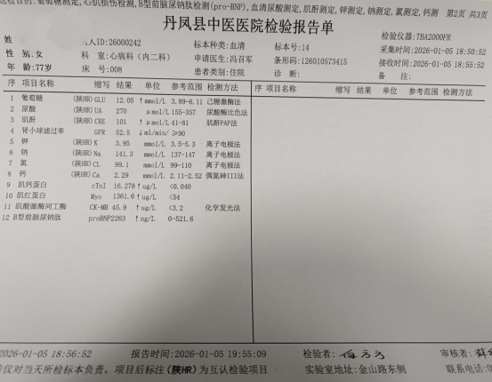 时间回溯到2026年1月5日,丹凤县中医医院“云心电”发现一例急性心肌梗死患者,心内科立即电话联系,得知患者为78岁女士,以“突发剧烈胸痛、头晕、呕吐”为主要症状,口服药物无缓解,拟转外院治疗,经医院心内科联系后,由镇卫生院紧急送至我院心血管内科。接到通知后心内科主任姜波立即启动“胸痛绿色通道”,做好急救准备,一场与死神赛跑的较量就此展开。