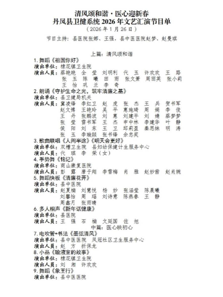 蛇舞辞旧岁,马驰报新春。2026年1月26日晚,商洛市丹凤县医院四楼会议室灯火辉煌,欢声笑语不绝于耳。由丹凤县卫健系统工联会主办、丹凤县医院承办的“清风颂和谐·医心迎新春”全县卫生健康系统2026年文艺汇演在此隆重举行。本次文艺汇演由全县卫健系统干部职工参演,所有节目均为自编自导、精心创作,生动展现了干部职工团结向上、多才多艺的精神风貌,整场演出情感真挚、精彩纷呈。市卫健委包抓联系领导、县级有关领导、县级有关部门(单位)负责同志、卫健系统干部职工及家属代表共计300余人现场观看。