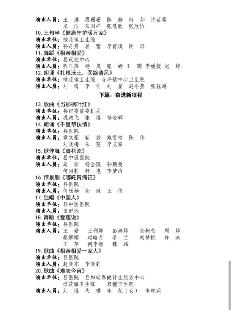 下篇奏响奋进旋律,歌曲《当那枫叶红》激情豪迈;朗诵《千里帮扶情》讴歌无私帮扶的深厚情谊;歌伴舞《青花瓷》演绎唯美意境;情景剧《哪吒胃痛记》创意独具,寓教于乐;独唱《中国人》凝聚爱国新声;舞蹈《爱莲说》以灵动舞姿诠释清廉高洁的品格;最后,汇演在全体合唱《难忘今宵》的感人旋律中圆满落幕,展现了卫健系统同心同行、共创未来的坚定信念与昂扬姿态。