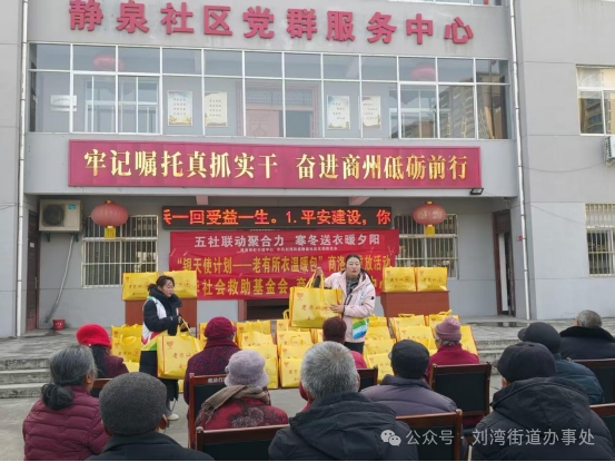 为弘扬尊老敬老的传统美德,保障辖区困难老人温暖过冬,1月27日,商洛市商州区刘湾街道静泉社区联合商洛彩虹公益中心开展“银天使计划——老有所衣温暖包”发放活动,以实际行动传递社会温情,让寒冬充满暖意。参与本次活动的老人、志愿者共计50余人,现场氛围热烈而温馨。