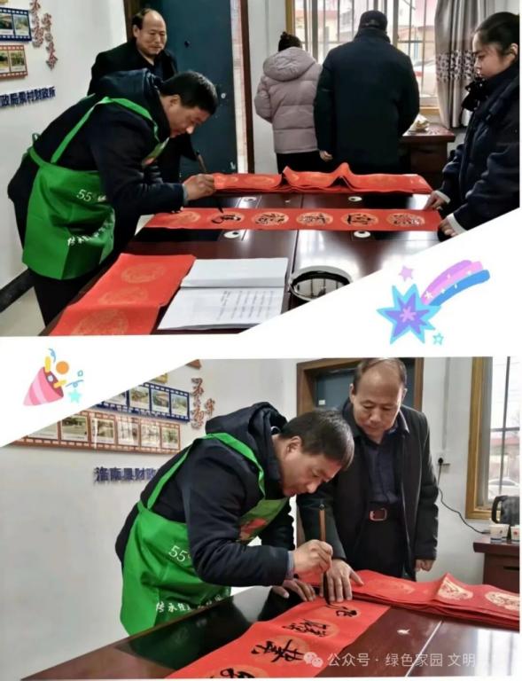 在景村财政所新时代文明实践点,活动现场暖意融融、墨香四溢,红彤彤的春联在书法家的手里徐徐展开,整个站点洋溢着喜庆的节日氛围。书法家们满怀热忱,铺纸、挥毫,一气呵成,笔锋或苍劲有力、或飘逸洒脱,在红纸上尽情挥洒。“龙腾四海迎新岁,马跃九州启华章”“春临福邸人兴旺,福到家门事顺昌”,一副副寓意吉祥、饱含祝福的春联,既有着对新年的美好期许,也饱含着老科协景村镇分会对基层干部群众的真挚关怀。