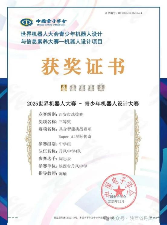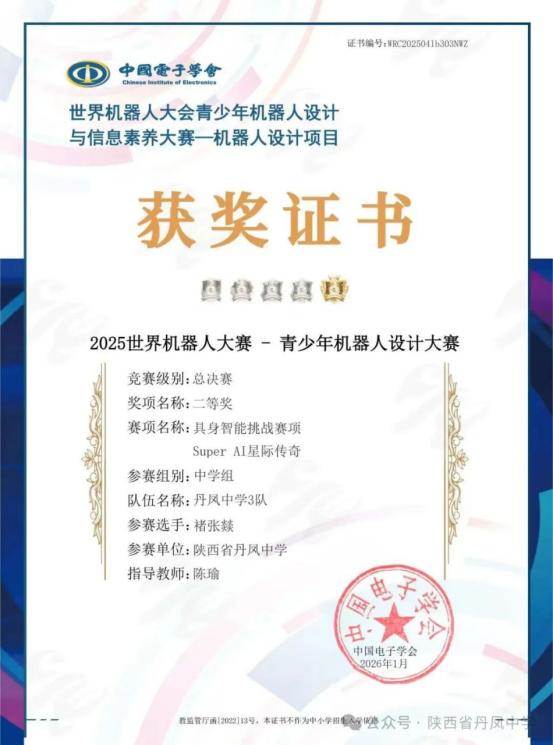 此次世界机器人大赛的优异成绩,既是丹凤中学学子科创实力的集中展现,也是学校深化“科创+AI”教育、践行五育融合育人理念的生动实践。未来,丹凤中学将继续深化科技与教育的深度融合,以更完善的课程体系、更优质的实践平台,助力更多学子点燃科创梦想,在新时代的创新浪潮中勇立潮头、逐梦前行!