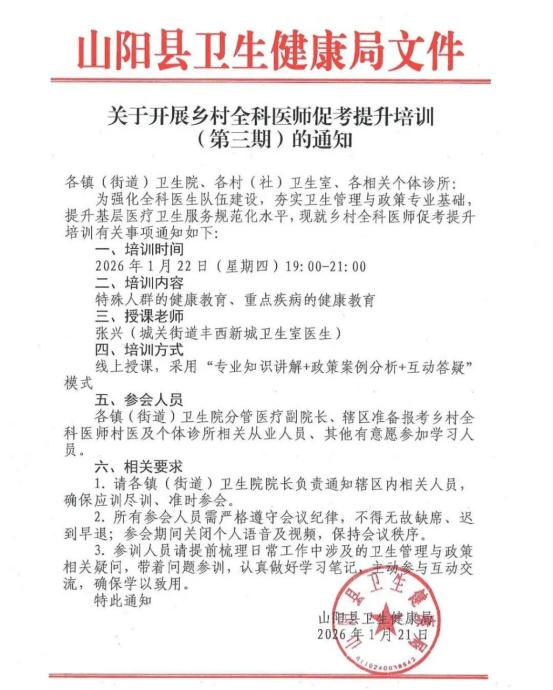 为确保培训实效,采用“线上授课+互动赋能”的灵活模式,每期培训均设置“专业知识精讲+政策案例分析+实操心得分享+现场答疑解惑”全流程环节,要求参训人员提前梳理工作疑点、熟悉知识点框架,带着问题学、结合实践悟。同时明确纪律要求,参训人员需全程关闭语音及视频,保持良好会议秩序;各镇(街道)卫生院院长牵头负责辖区人员通知工作,确保符合报考条件的村医、个体诊所从业人员及有提升意愿的医务人员“应训尽训、全员覆盖”,让培训红利直达基层医疗服务“神经末梢”。此次培育体系的构建,是深化基层医疗改革的重要举措。此前,已通过与西安交通大学第一附属医院等上级医院开展“组团式”帮扶、出台《山阳县人才强卫十条措施》、建设名老中医药专家传承工作室等多重举措,为基层医疗人才成长铺路搭桥。而“持证带教+固定培训+职务赋能”的创新模式,进一步激活了本土人才“传帮带”的内生动力,让基层医务人员无需远行就能便捷学、精准学,通过“学用结合”快速提升诊疗服务能力与执业考试应试水平,为持续壮大高素质基层医疗队伍提供了坚实支撑。下一步,山阳县将持续优化培育体系,动态调整培训课程以适配基层医疗服务新需求,完善村医考核与激励机制,推动“本土人才培育+基层服务提升”良性循环,让更多优秀基层医务人员成长成才,为全县群众的健康福祉筑牢坚实屏障。