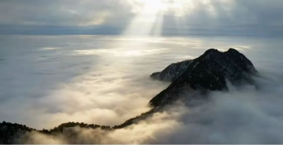 大顶观景台,晨光破云时金辉洒落,雪覆峰峦与云海交融,宛若神祇的调色盘