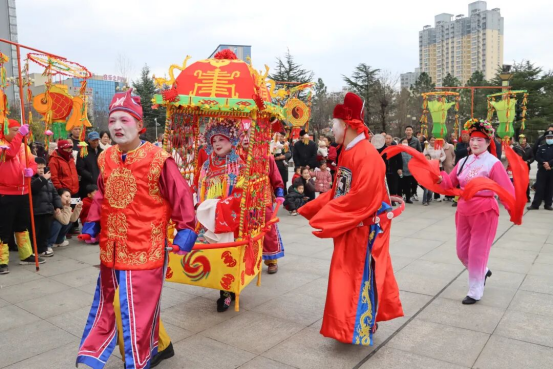花灯节目内容丰富多样,麒麟、舞龙、舞狮、划旱船、抬花轿、竹马等惟妙惟肖、色彩绚丽、引人入胜,特别是邀请的河北省黄骅市三科牛国家级非遗麒麟舞让人眼前一亮,只见麒麟造型集龙头、鹿身、马蹄、牛尾、狼额于一身,身披五彩鳞甲,在锣鼓唢呐的伴奏下跳跃舞动,场面气势磅礴、雄风浩荡,众人纷纷拍照打卡。