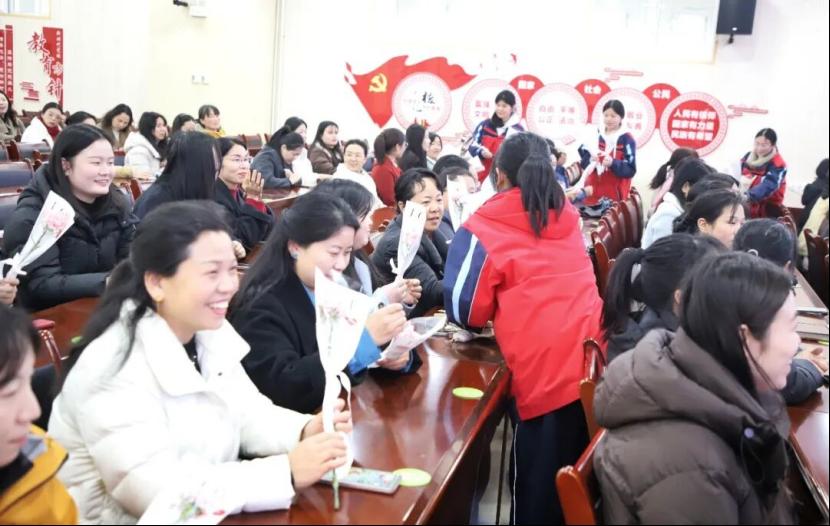 随后,学生代表为辛勤耕耘的女教师们献上芬芳鲜花,一束束娇艳的花朵,承载着学子们最真挚的敬意与感恩,定格下师生情深的温暖瞬间。