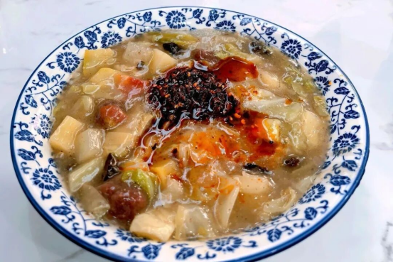 稠糊汤,更是这片土地的味觉底色。玉米磨成糁子,铁锅文火慢熬,直到变成琥珀色的琼浆。配一碟酸菜、白萝卜丝或莲花白丝,便是刻进骨子里的晨味。