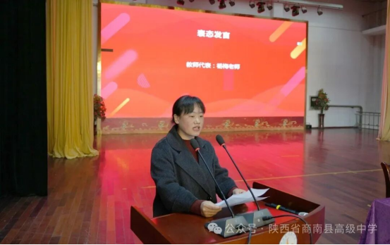 教师代表高三15班班主任杨梅老师以“坚守初心、深耕课堂”为誓言,承诺将以专业素养与温暖陪伴,做学子成长路上的引路人。她寄语全体学子坚定信念、科学备考、全力以赴,用坚守与拼搏书写青春答卷。