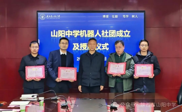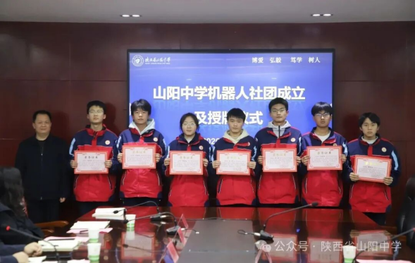 科技点燃梦想,创新成就未来。为充分发挥捐赠设备价值,培养学生科创素养,山阳中学首届机器人社团正式成立。副校长苏汉民为社团授牌,标志着我校科创教育体系再添新阵地,学生多元发展平台进一步完善。