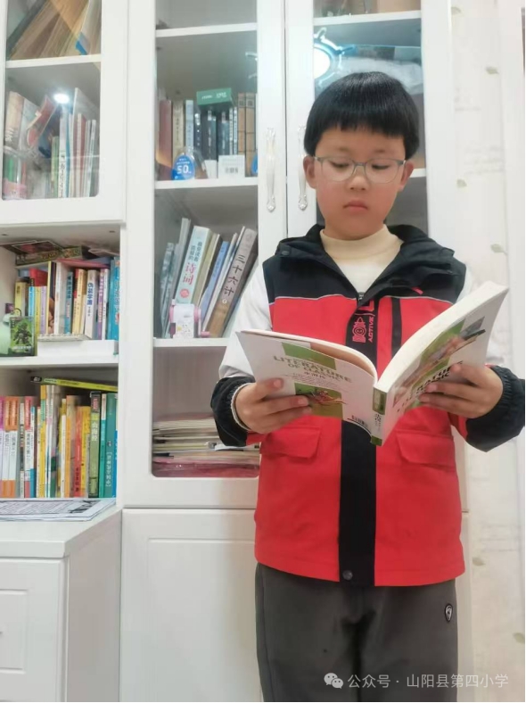 大家好,我是山阳县第四小学五(1)班的赵鹏涛。我的爸爸妈妈都是老师,书香萦绕的家庭氛围,让我从小便与书结下了不解之缘。