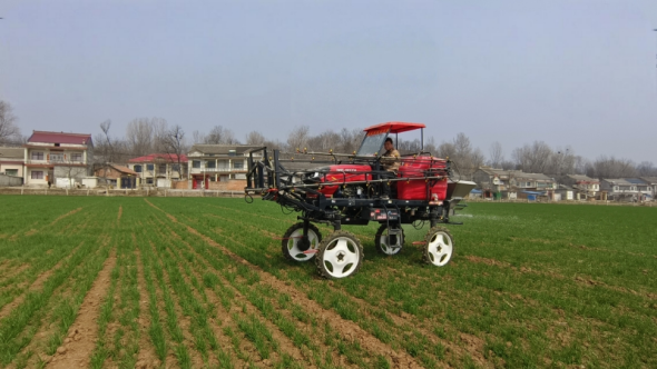 “自从用上这台自走式喷杆喷雾机,田间作业效率大幅提高。”洛南县雄风农机专业合作社理事长何超看着正在作业的农机,欣喜地介绍,“这台机械一次能装载四袋尿素,既能施肥又能喷药,省时又省力。”