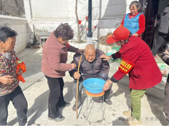 随后,志愿者们来到辖区内的黑山镇敬老院,为院里的老人们提供洗头、理发等服务。大家一边耐心细致地为老人打理头发,一边与他们拉家常、聊近况,现场气氛温馨融洽。与此同时,部分志愿者拿起扫帚、抹布,认真清扫院落、整理房间,让敬老院的环境更加整洁舒适。