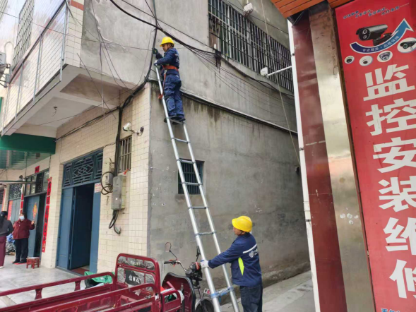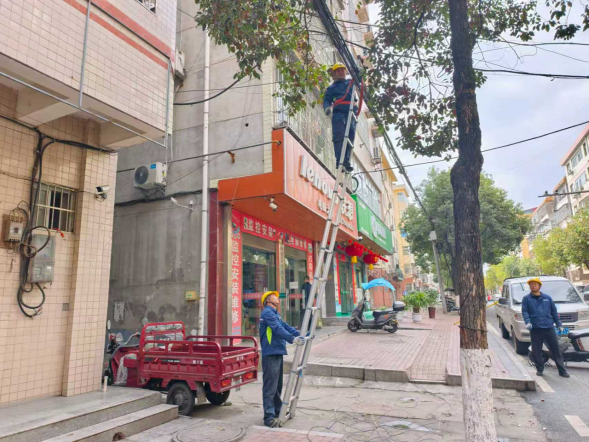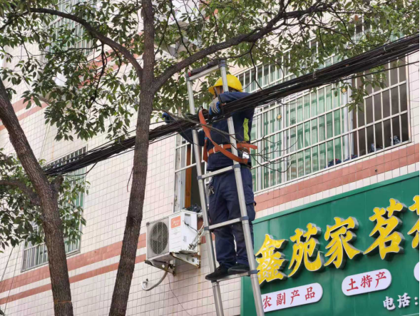 在东岗茶艺街片区,中国移动商南分公司的线路维护人员刘宏正在对沿街商户门头上方凌乱的“飞线”进行集中清理。“这片商户多,以前各家拉线缺乏统一规划,有的线垂到了半空中,既影响美观也不安全。”刘宏一边用扎带固定线缆一边说,“整治过程中我们尽量把线缆贴墙走、隐蔽化,商户们都很配合,有的还主动给我们送水。”