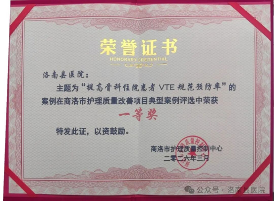3月25日,商洛市护理质量控制工作会议暨护理质量改善项目典型案例评选在商洛市中心医院顺利召开。洛南县护理质量控制小组在年度评选中脱颖而出,荣获县级“优秀护理质量控制小组”称号。同时,洛南县医院作为洛南县护理质量控制小组挂靠单位,依托扎实的管理基础与创新的专科实践,充分展现了在护理质量管理与质量改善领域的良好成效。由我院骨一科申报的“提高骨科住院患者静脉血栓栓塞症(VTE)规范预防率”改善项目,在护理质量改善项目典型案例评选中斩获一等奖。