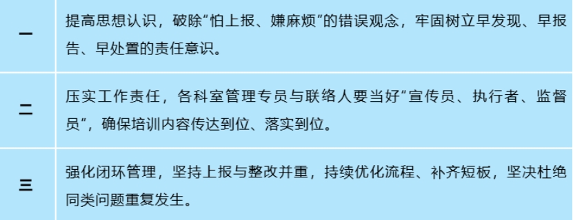 此次培训进一步统一了思想、明确了标准、规范了流程,有效提升了全院不良事件管理水平。下一步,医院将持续强化医疗质量安全管控,健全激励与约束机制,推动人人重视、人人参与、人人上报、人人尽责的安全文化落地见效,为保障患者安全、推动医院高质量发展筑牢坚实安全屏障。