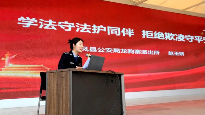 丹凤县公安局龙驹寨派出所干警以《学法守法护同伴 拒绝欺凌守平安》为主题,围绕什么是校园欺凌、欺凌的危害与后果、如何防范和应对欺凌等内容进行讲解,引导同学们团结友爱、互帮互助,勇敢对校园欺凌说 “不”。